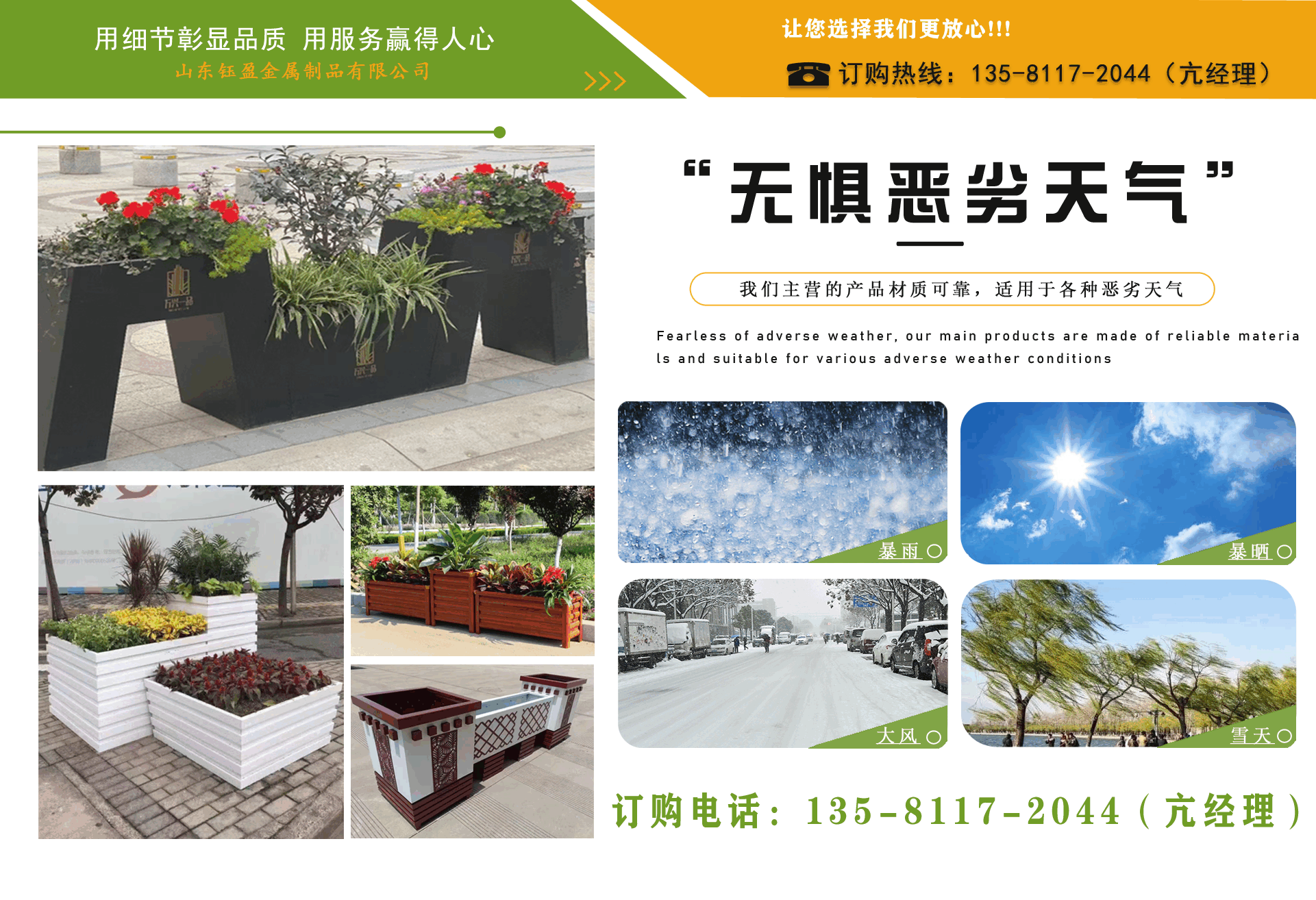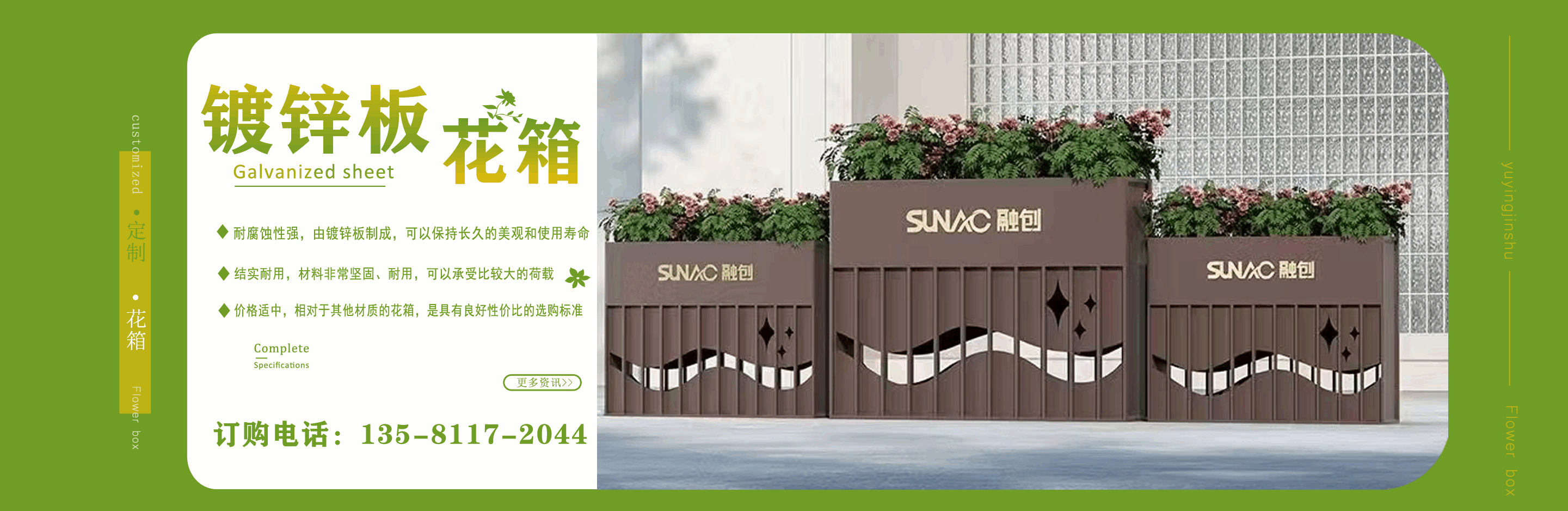 山東鈺盈金屬制品有限公司主營鍍鋅板花箱,道路隔斷花箱,定制花箱,戶外道路花箱,花箱座椅等產品,產品結構合理、性能優良,具有強度高、耐腐蝕、抗老化、隔熱隔音、節約能源、外形美觀、使用壽命長等優點,深受國內外客戶認可。 我們根據客戶所在城市的文化特征,制造出符合當地城市文化氣息的自然立體、觀賞性強的花箱產品成為城市里一道靚麗的風景線。 公司實行誠實、公正、守信、價格合理、平等互利。 公司憑借雄厚經驗實力,恪守誠信為本的原則,得到了眾多客戶的信賴,并在業界獲得良好的口碑。建立了穩固的合作關系,隨著業務的不斷發展和壯大,合作伙伴的范圍也在不斷擴大。我們熱情盼望與您的合作,為社會的可持續發展獻上一份努力。...